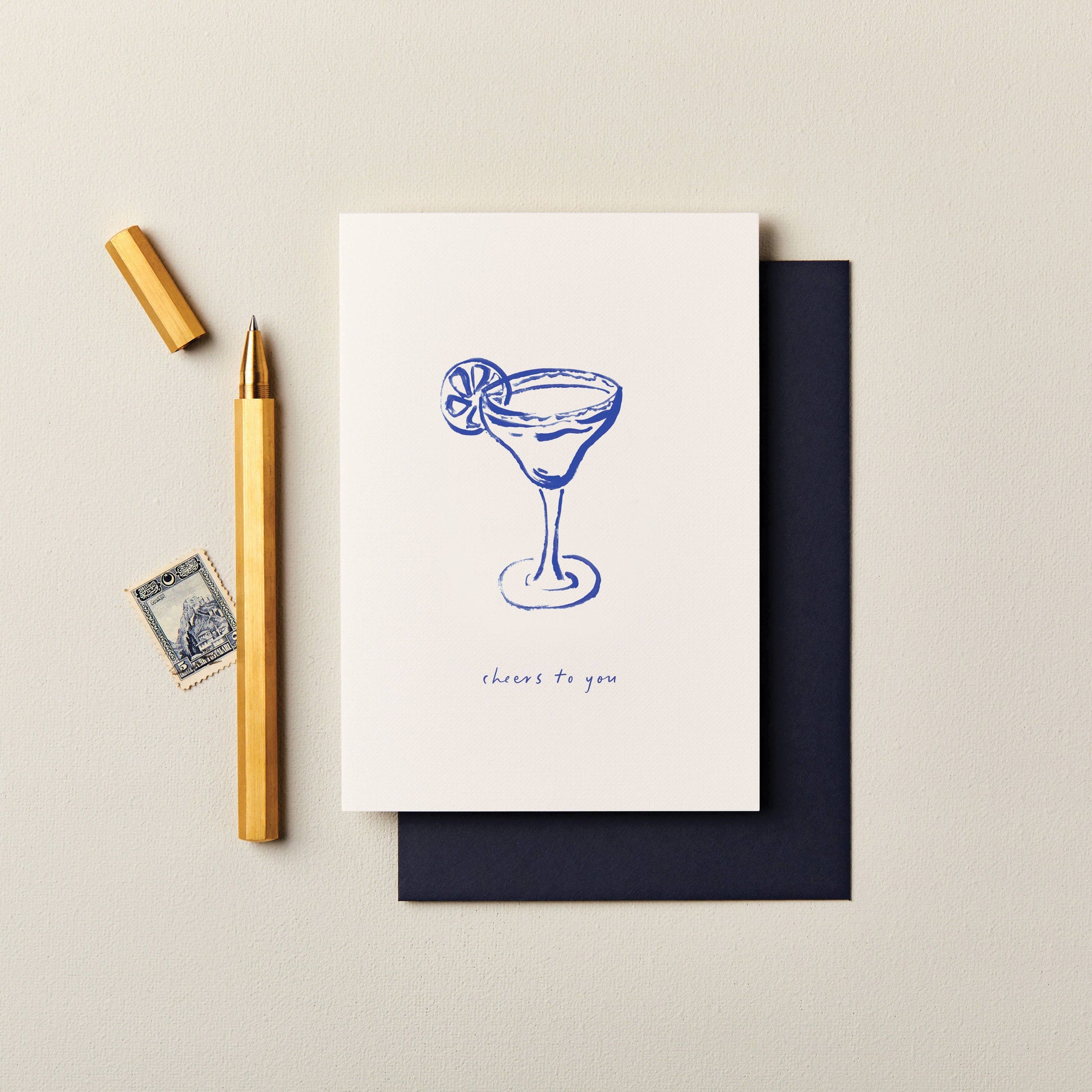 Illustrated birthday or congratulations card, with a hand-painted cocktail design in blue and 'cheers to you' in handwritten type. Perfect for females who like modern, chic & stylish stationery. This greeting card is part of our NEW Art Collection, featuring hand-painted illustrations with loose brush strokes.